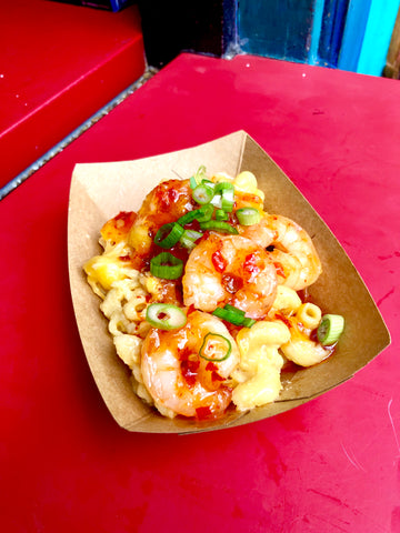 This dish could be replicated at home. Just use your favorite mac and cheese recipe, even if it's from a box. Pan sauté a few shrimp and put sweet chili sauce and sliced scallions on top. Sweet chili sauce can be found in the ethnic aisle of your grocery store. And it's pretty awesome on just about anything.