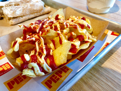 They are served in the potato chip bag inside are potato chips with Aioli and Brava Sauce. A little like Potato chips with mayo and ketchup.