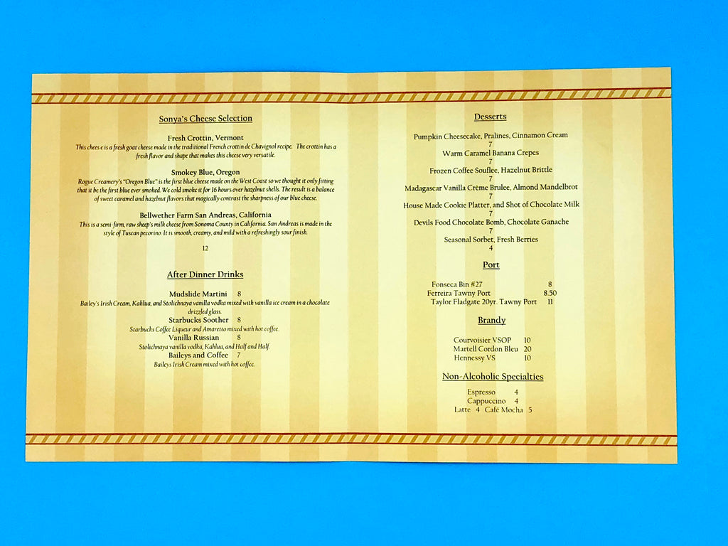 Sonya's was a quaint, dark wood, fine dining experience. I've saved a few of the menus from the past.