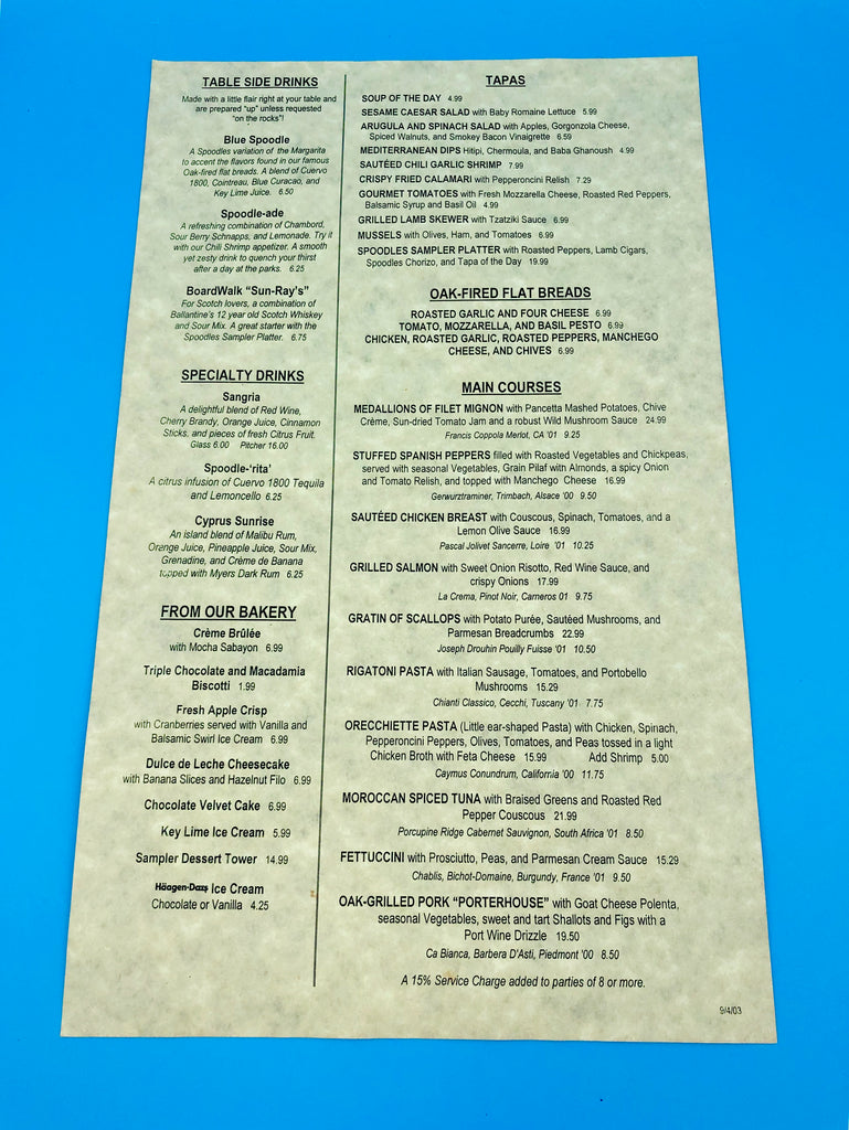 This restaurant is a blast from the past, a memory that deserves to be immortalized. After eating at Disney world for the last 48 years (since opening 1971) I have a lot of memories of Restaurants come and gone. Spoodles is remembered with fond memories. So much so that between 2002 and 2009 we visited this restaurant 5 times. That may not sound like much, but when you have hundreds of restaurants (I need to count them one day, my estimation is over 500) to choose from within 5 miles of your home choosing one that many times means it's one of the top on your list.