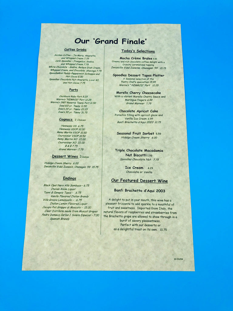 Spoodles opened July 1, 1996 and closed August 1, 2009. I don't have a lot of memories of this restaurant other than it was very open. Which helped get you in the mood for the great food with the aromas wafting out of the open kitchen. You could watch them cook yours and every other meal from anywhere in the dining room. The menus were mostly Mediterranean based foods. Starters included mussels, calamari, and mediterranean dips. Entrees included a wood grilled pork tenderloin that I can still remember the aroma of the wood fire, Chicken, fish, lamb and several pasta dishes. Desserts included crème brûlée, dessert tapas, cheesecake and biscotti.