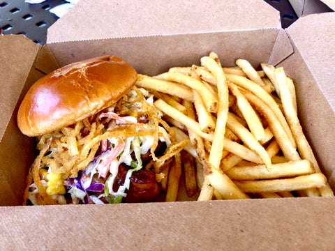 My absolute favorite is the Barbecued Pork Belly. It doesn't say that it's a sandwich but it is and it's served on the same beautiful bun as the fish sandwich. It includes thinly sliced pork belly dipped in barbecue sauce and piled high with cole slaw and deep fried onion strings. Think of it as a barbecue bacon sandwich. Yum, Yum, Yum. This is one of this sandwiches that if you try to take a bite I might stab you with my fork.